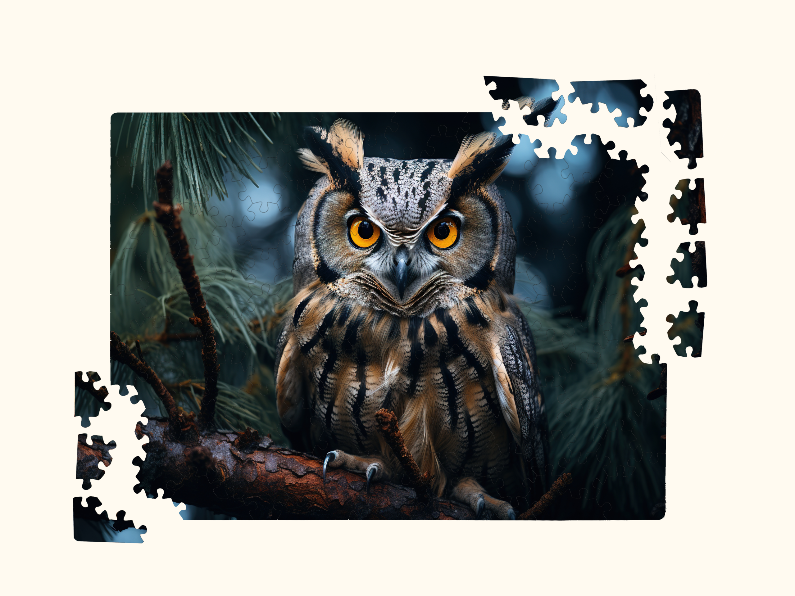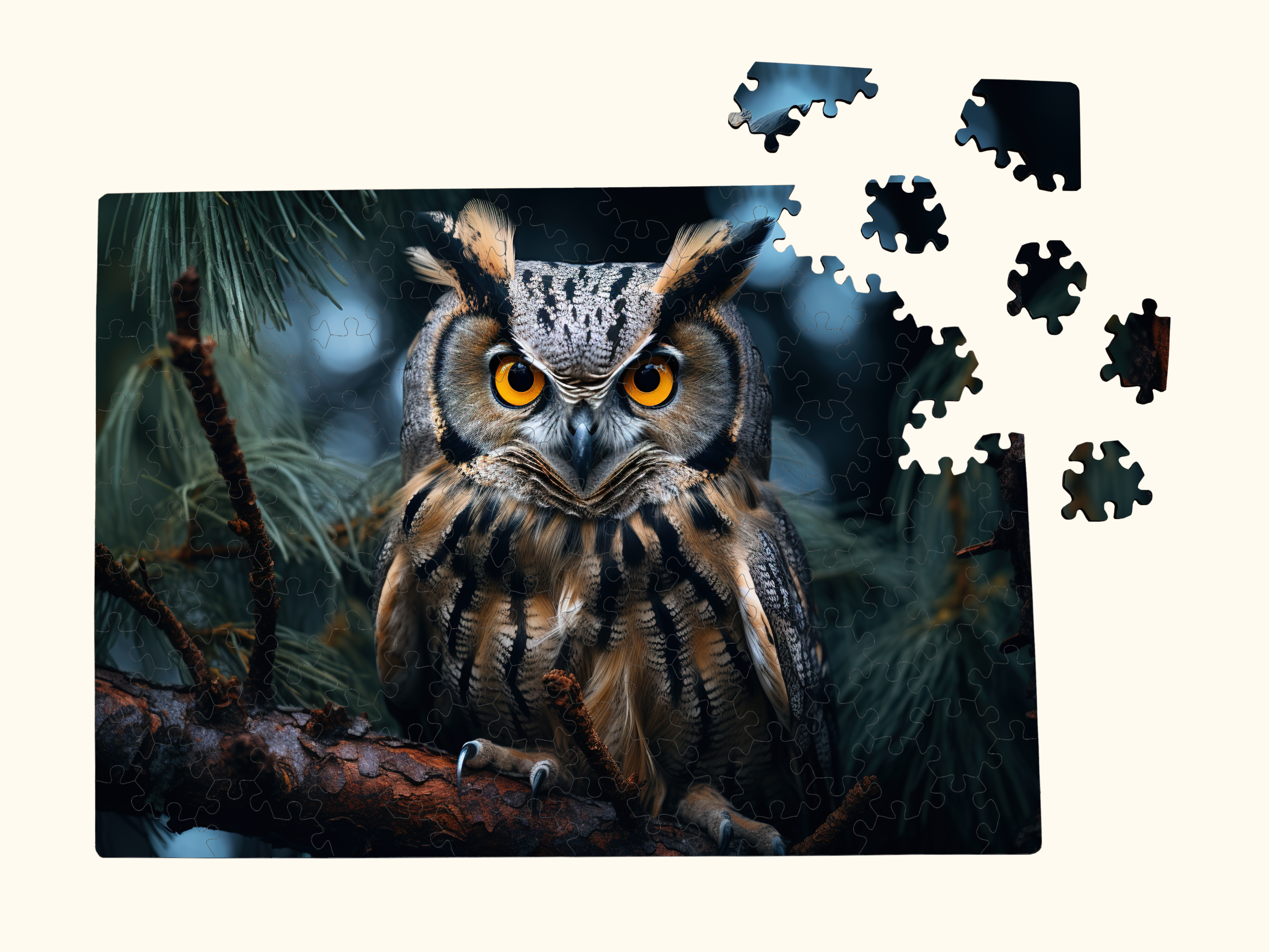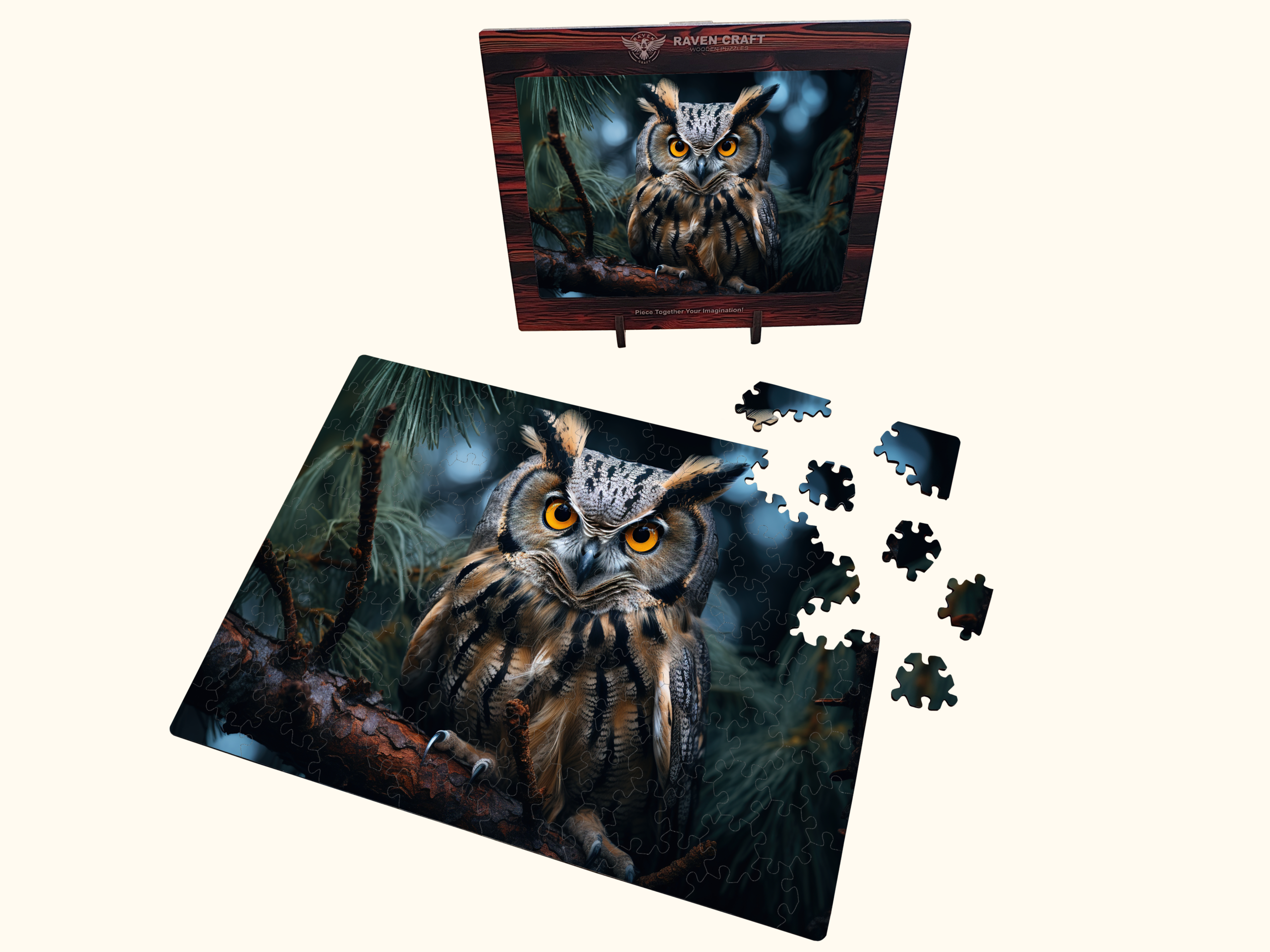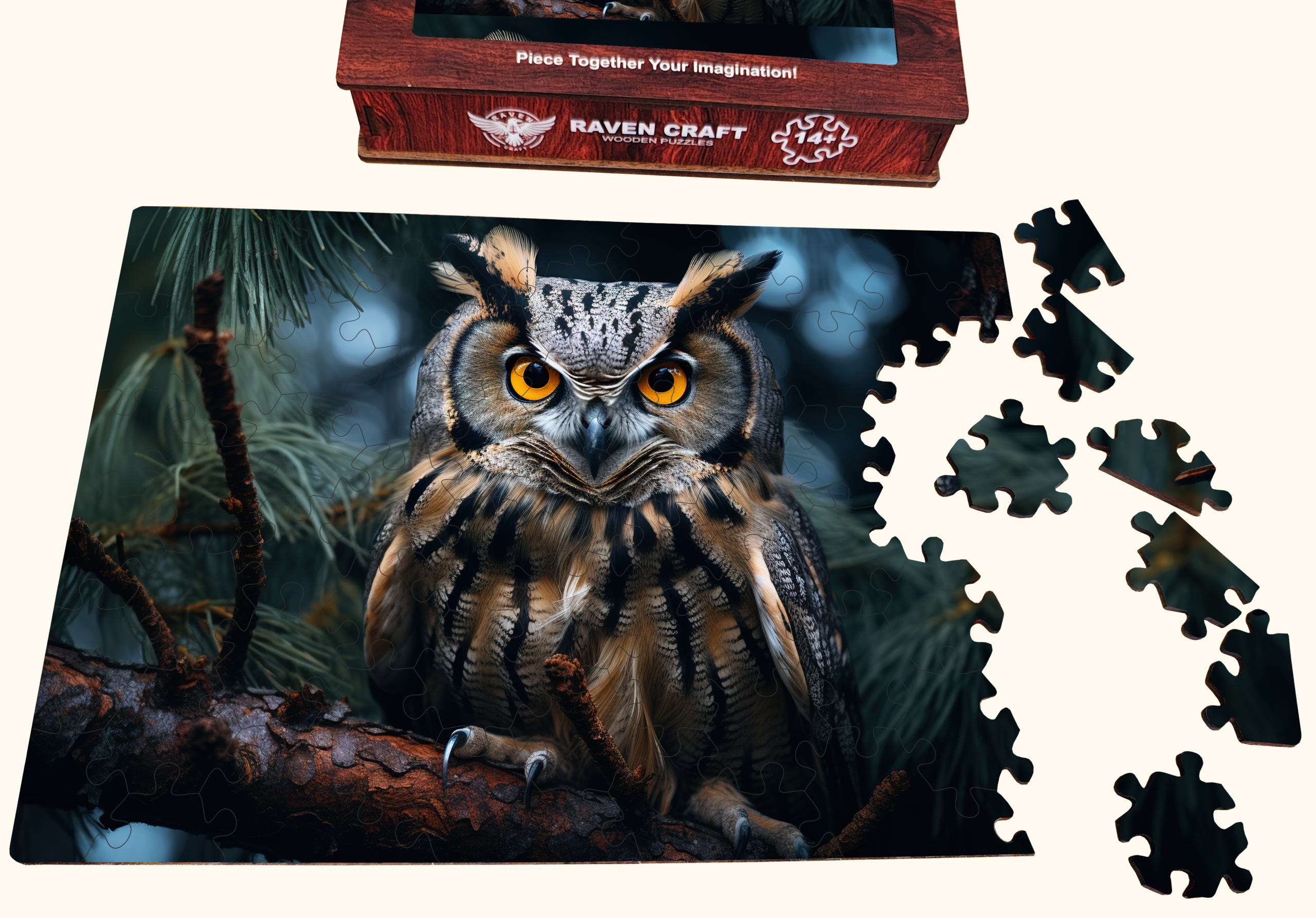 Wooden jigsaw puzzle with an owl illustration, puzzle box, assembled puzzle, loose pieces, and a personalized wooden greeting card displayed together.