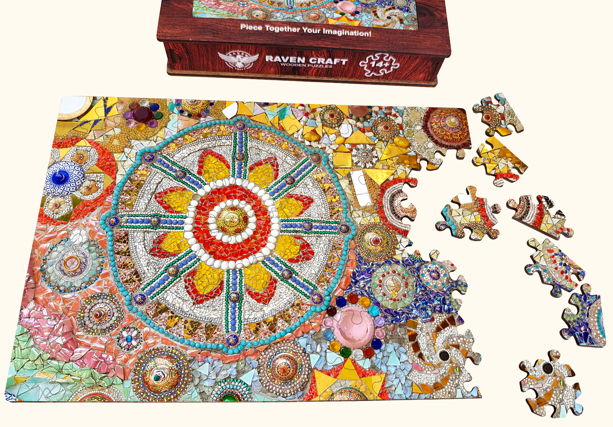 Inside you’ll find a vibrant wooden hexagonal puzzle featuring a dazzling mosaic mandala design – full of color, detail, and tiny elements that are a joy to explore. As you fit each piece, the artwork slowly turns into a display-worthy centerpiece that looks beautiful on any table or shelf.