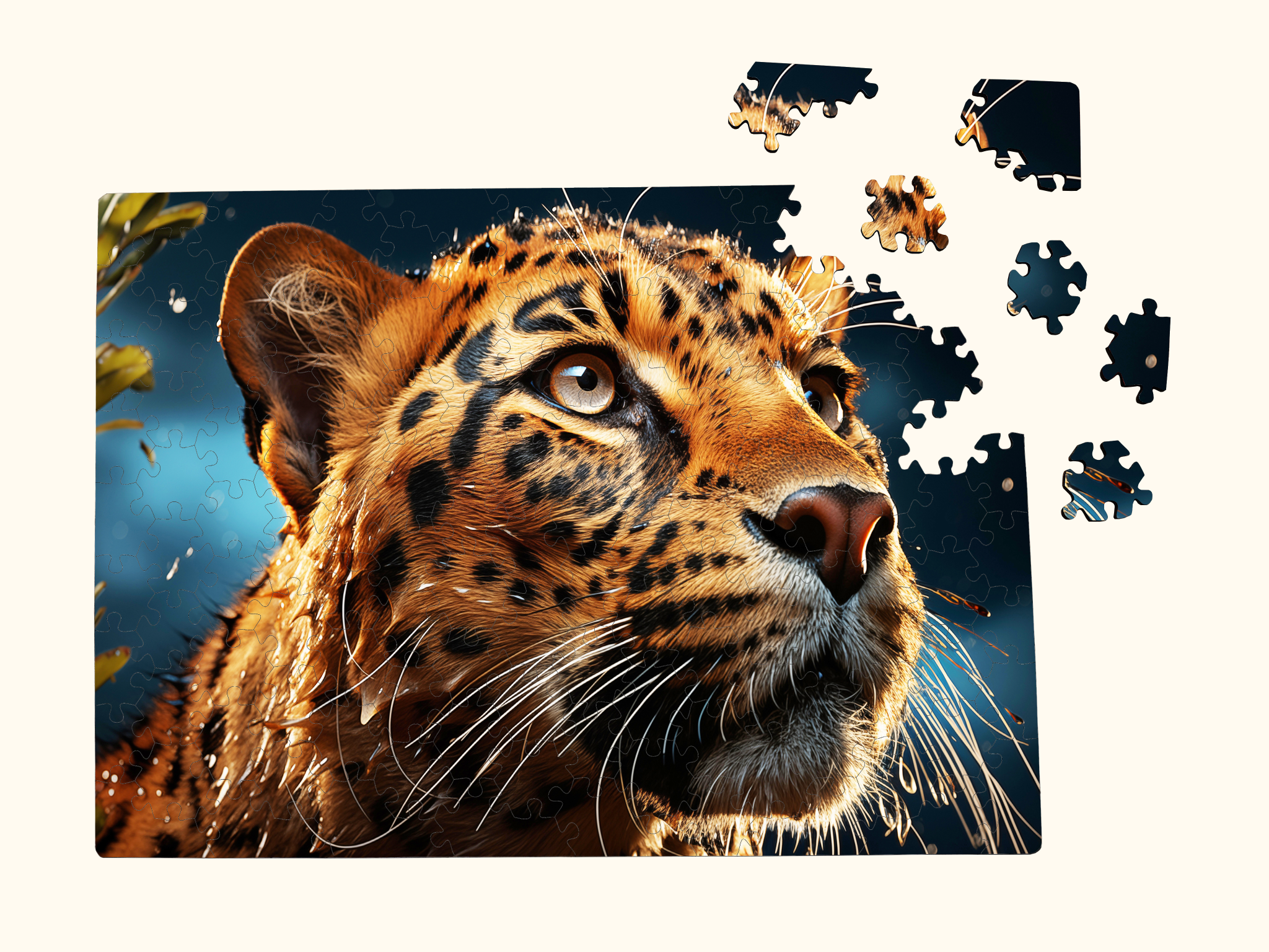 This wooden hexagonal puzzle features a stunning, high-detail leopard illustration that looks beautiful both during assembly and as a finished display piece.