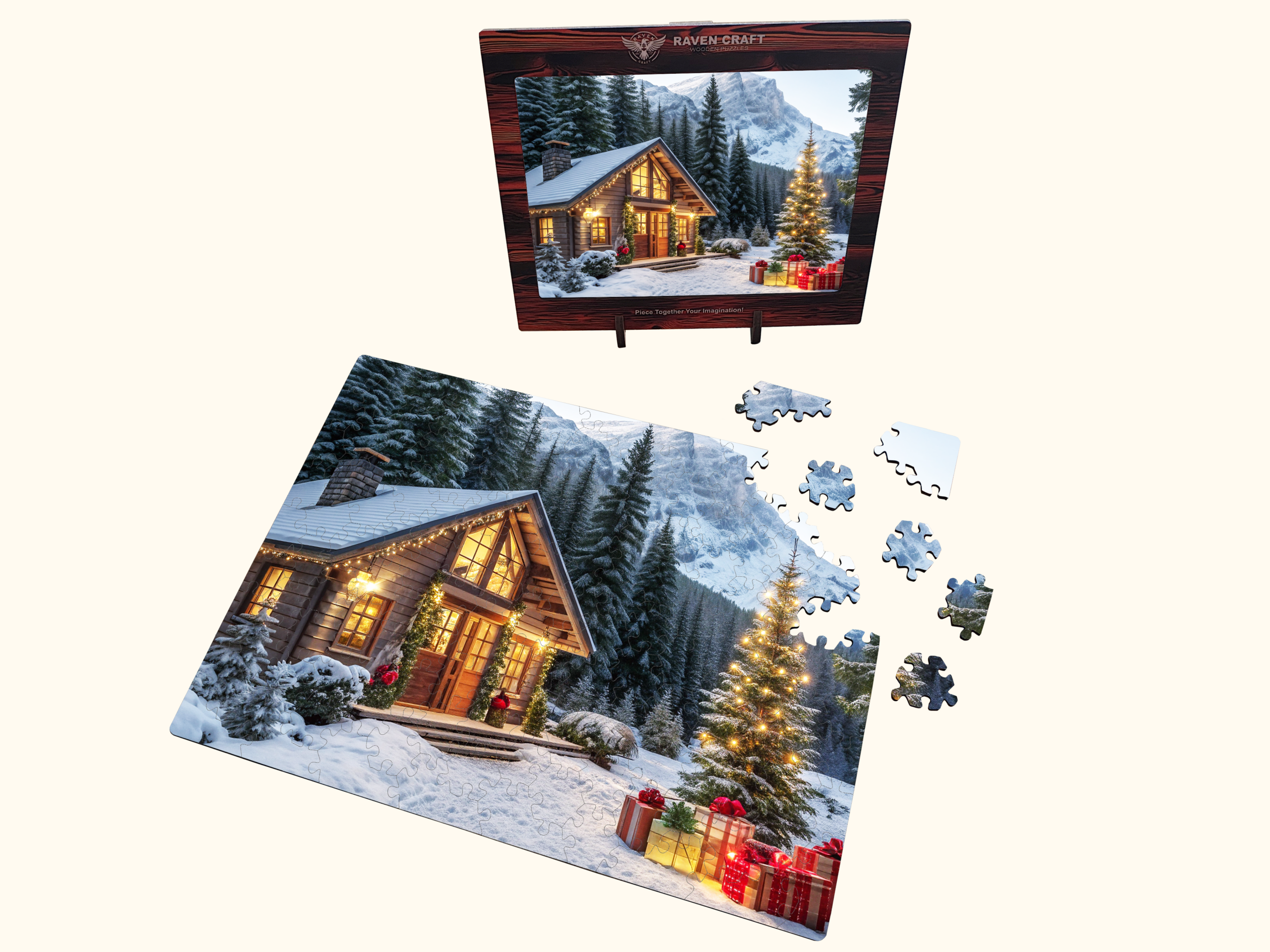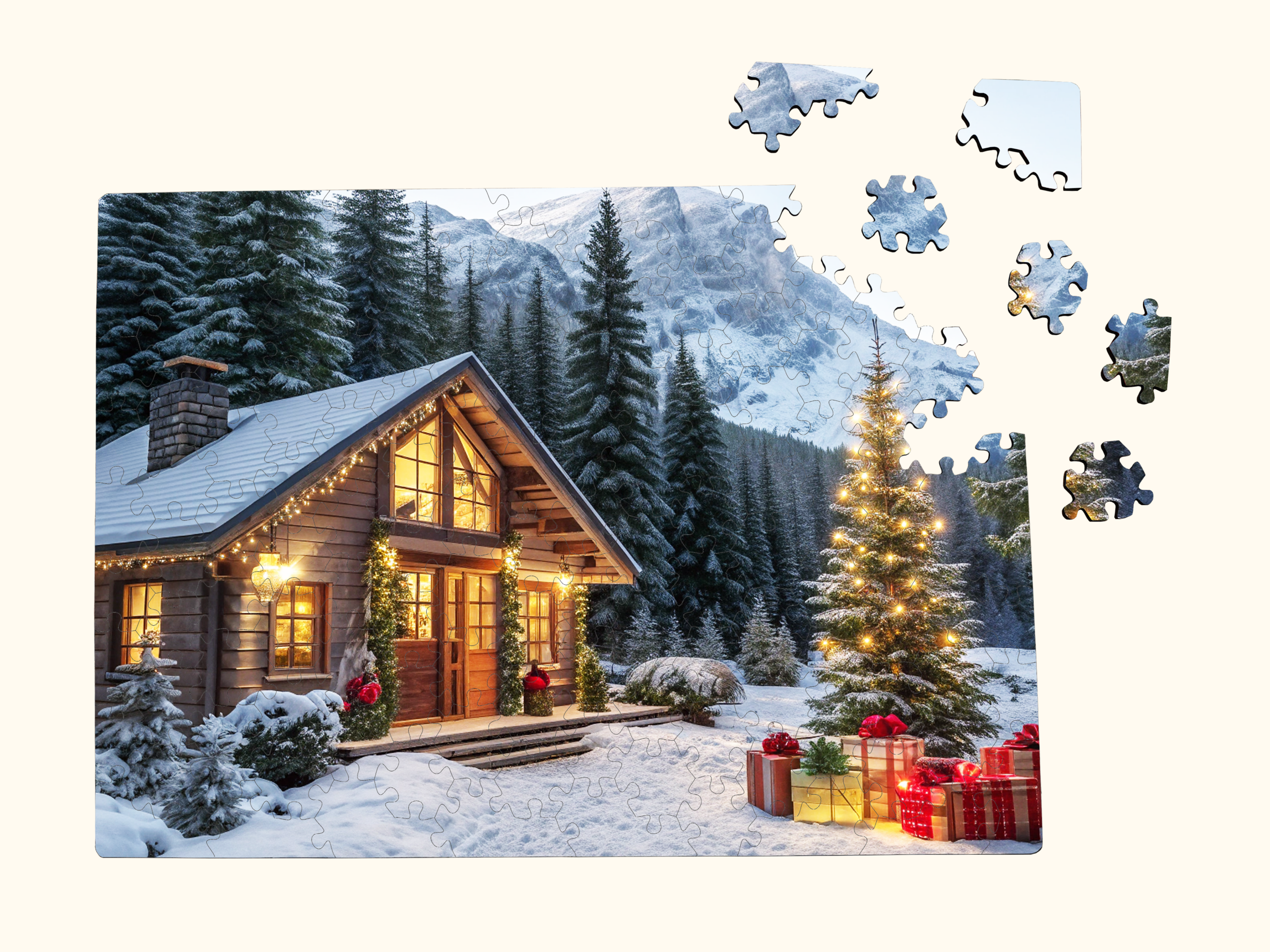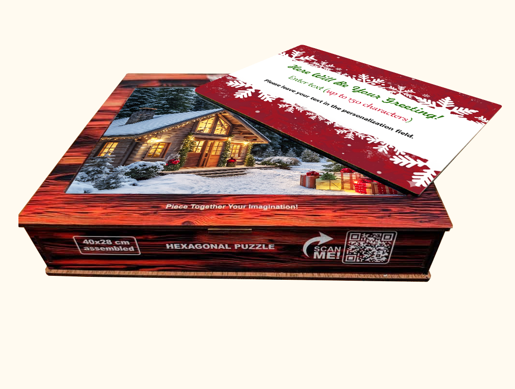 This wooden hexagon puzzle features a glowing winter cabin surrounded by mountains, Christmas lights, and gift-wrapped surprises scene that instantly feels magical.