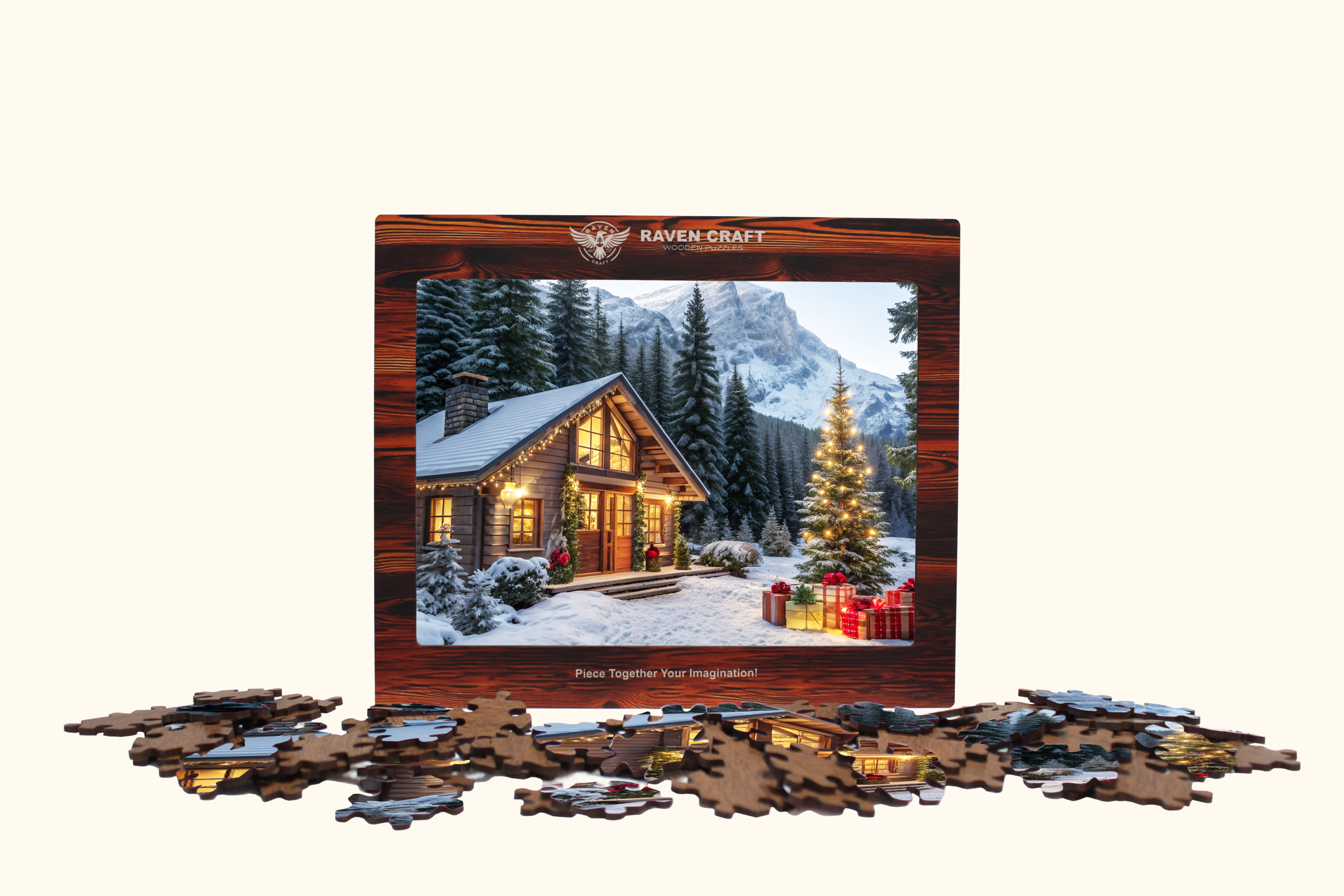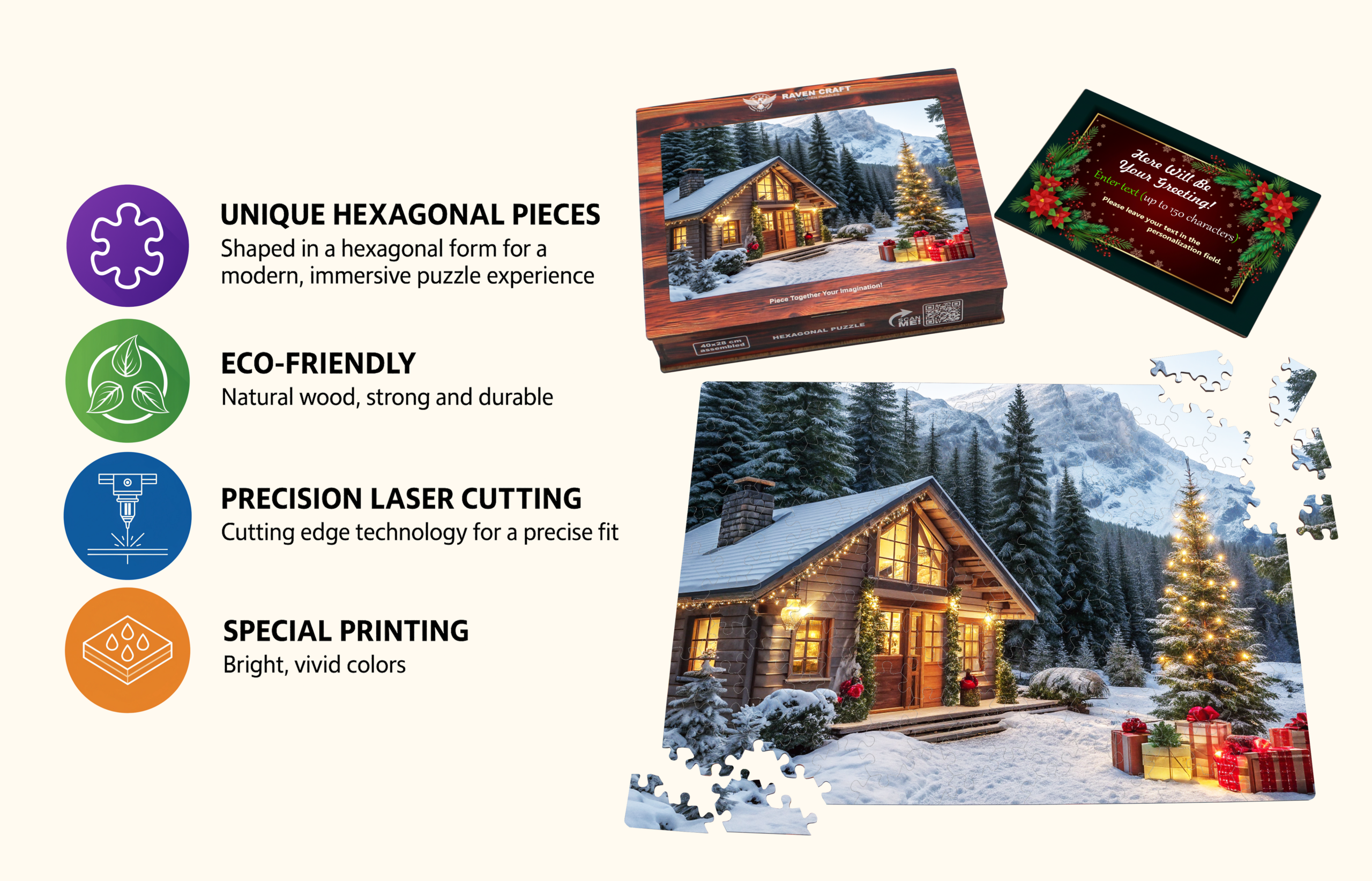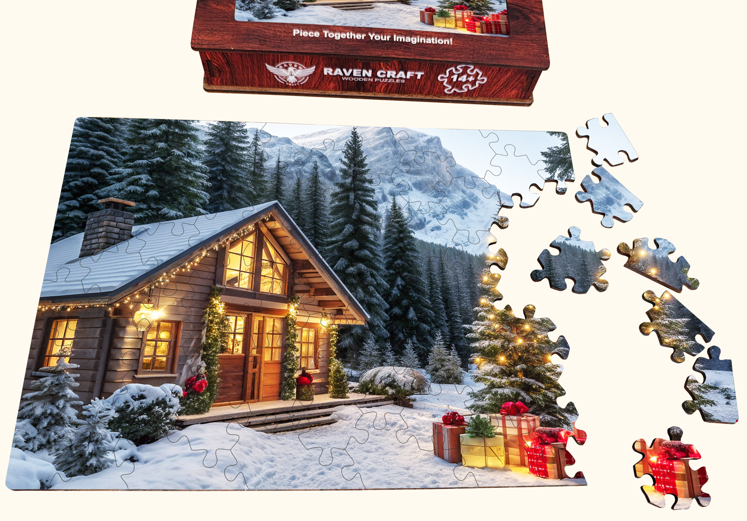 This wooden hexagon puzzle features a glowing winter cabin surrounded by mountains, Christmas lights, and gift-wrapped surprises scene that instantly feels magical.