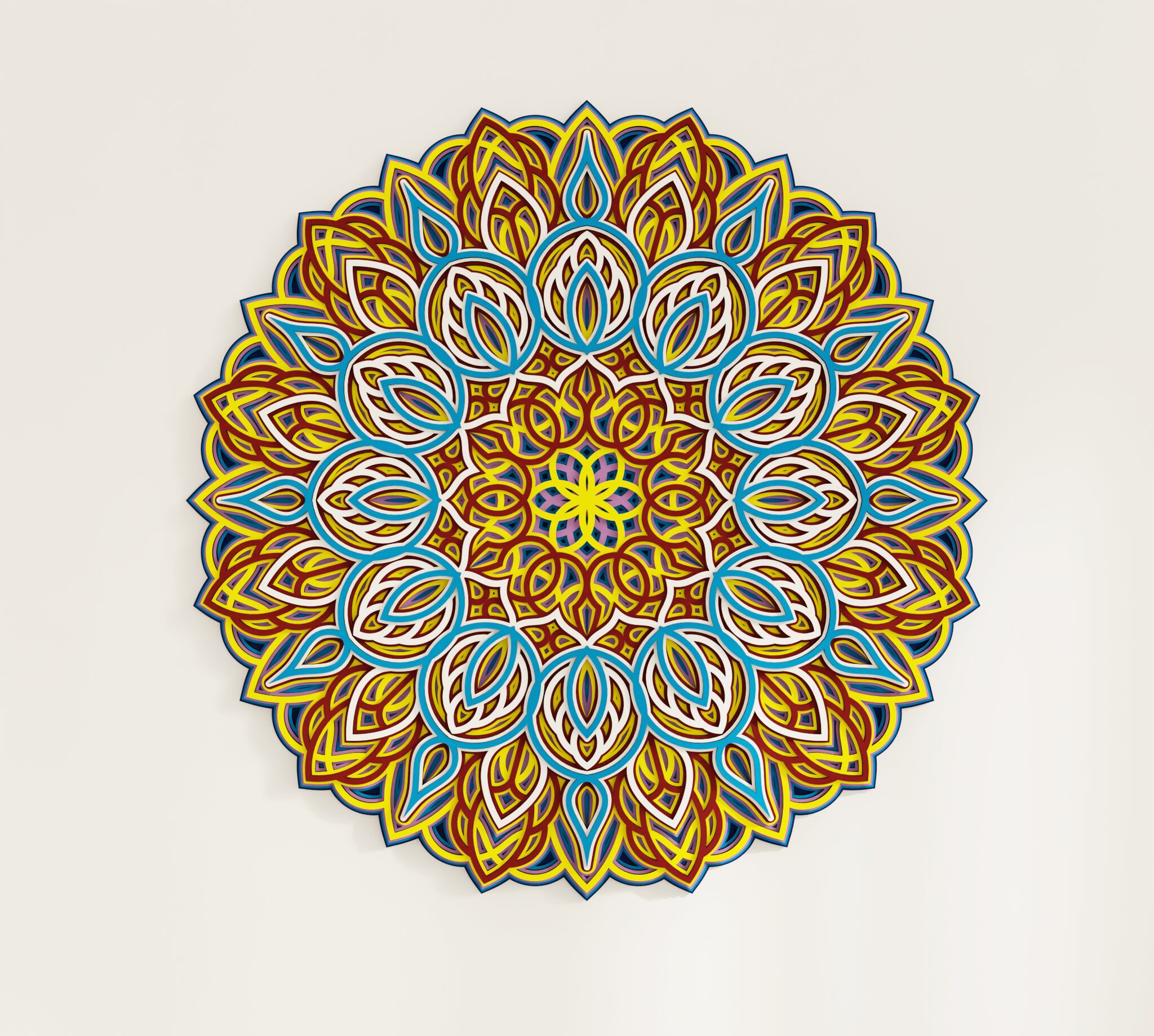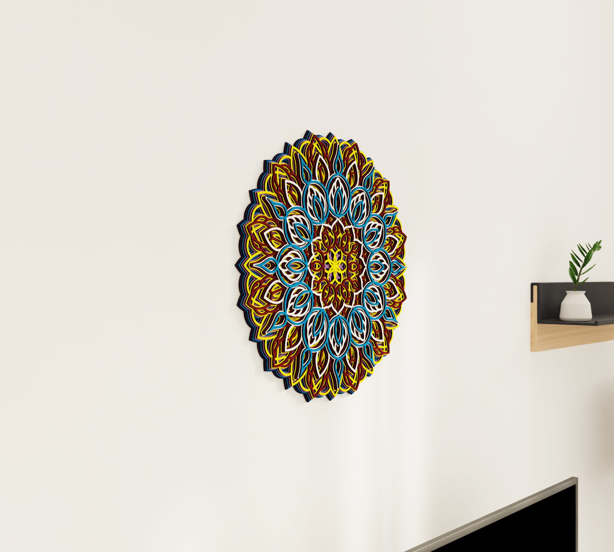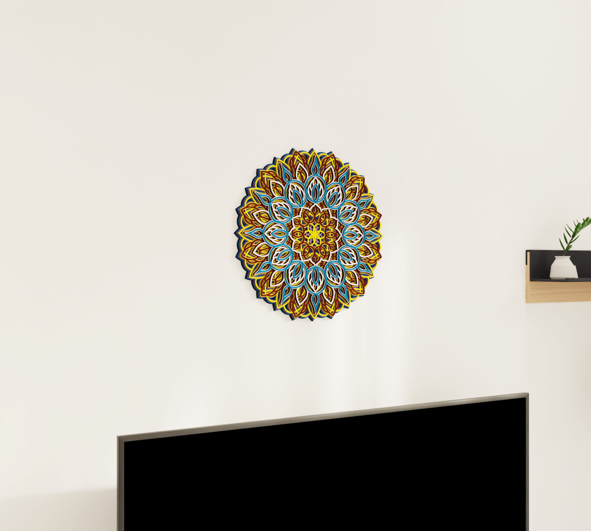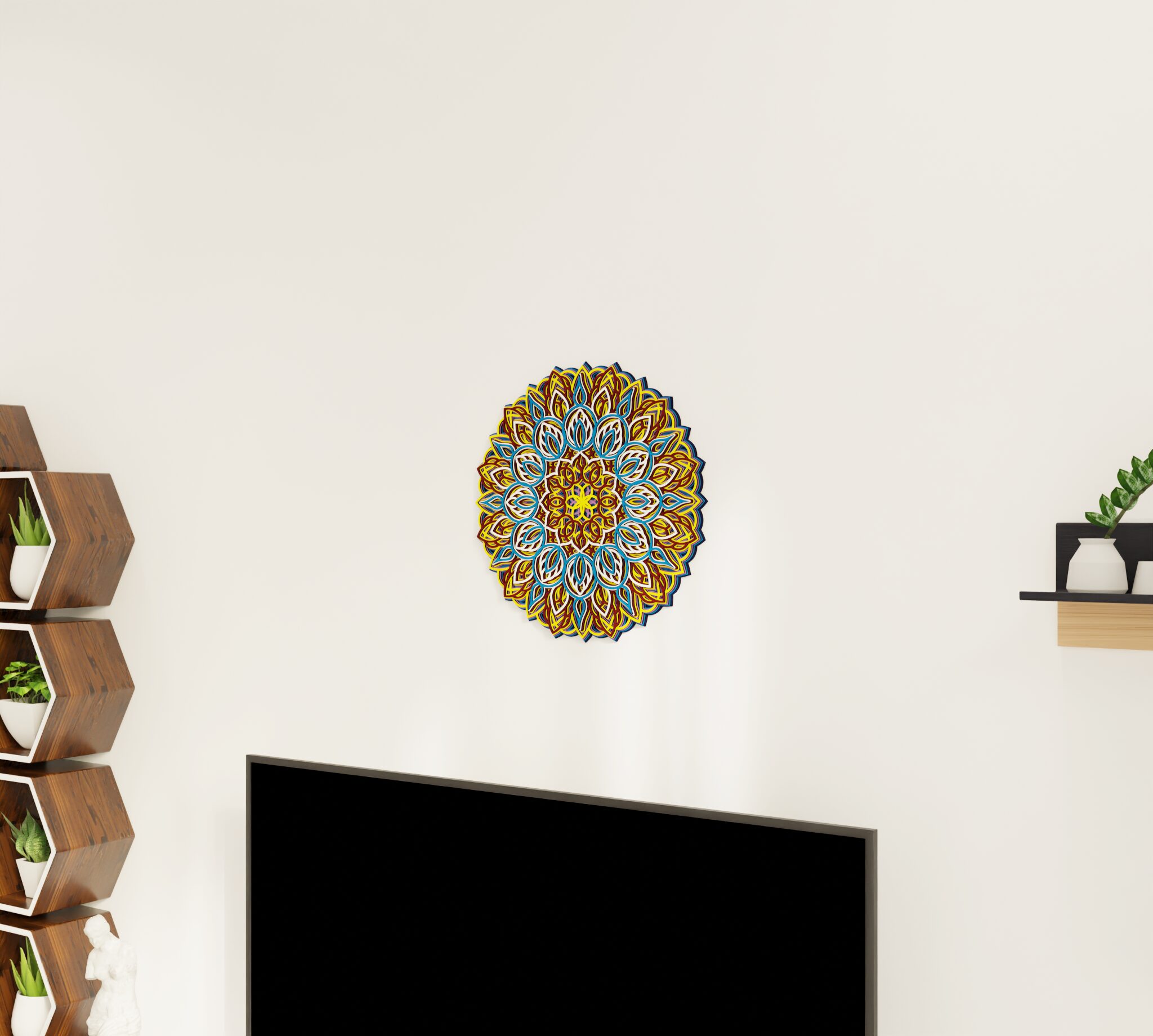 Bring refined character to your wall with this striking multilayer wall decor. Designed as a wooden mandala, it features a symmetrical round composition with carved decorative details and a layered structure that creates clear visual depth. The combination of natural wood and color gives the piece a rich, dimensional look that stands out without feeling heavy. It suits living rooms, bedrooms, entryways, or any interior where you want a decorative focal point with a warm premium feel. A distinctive wall piece for buyers who want decor that feels elegant, detailed, and easy to place.