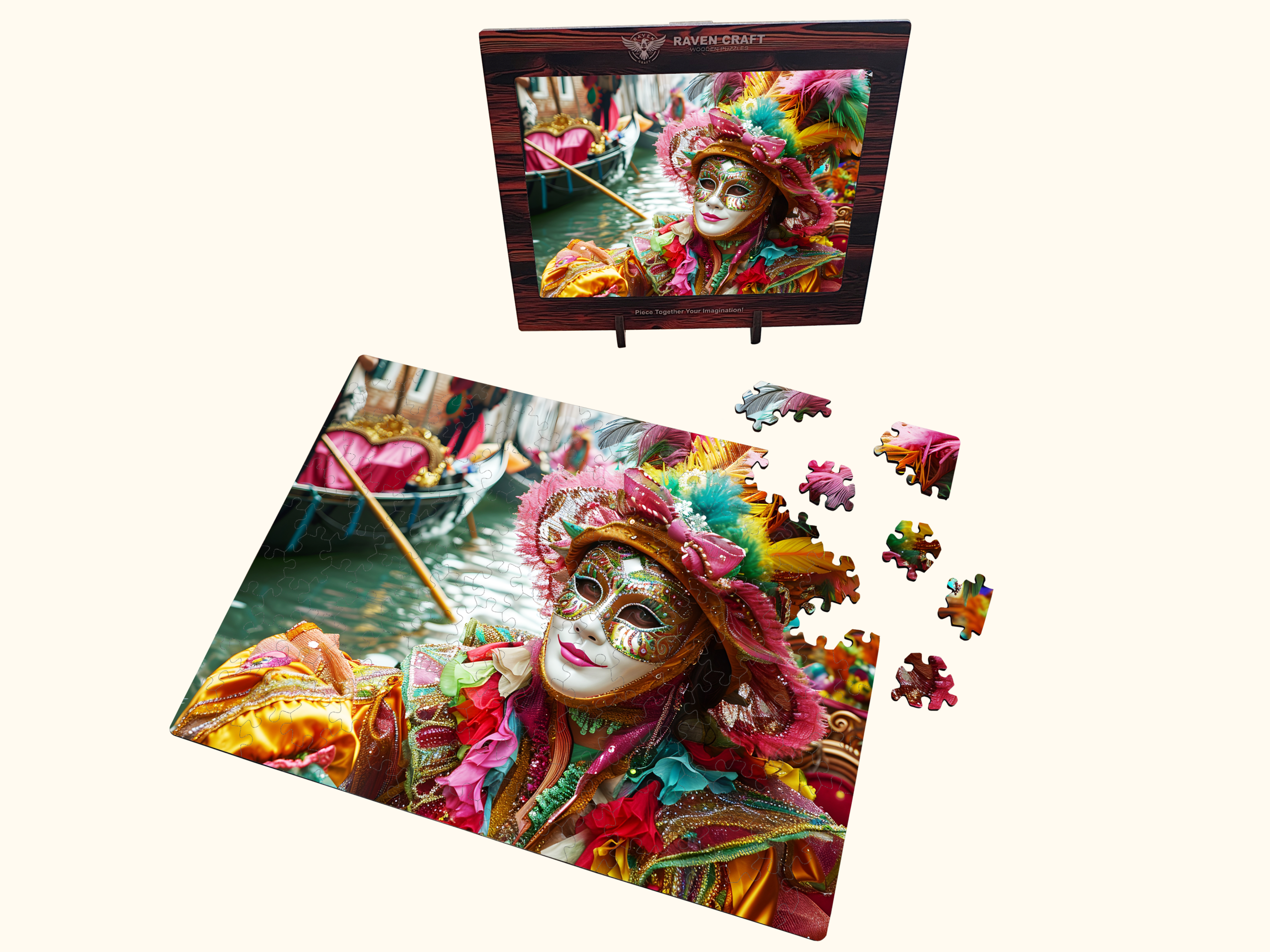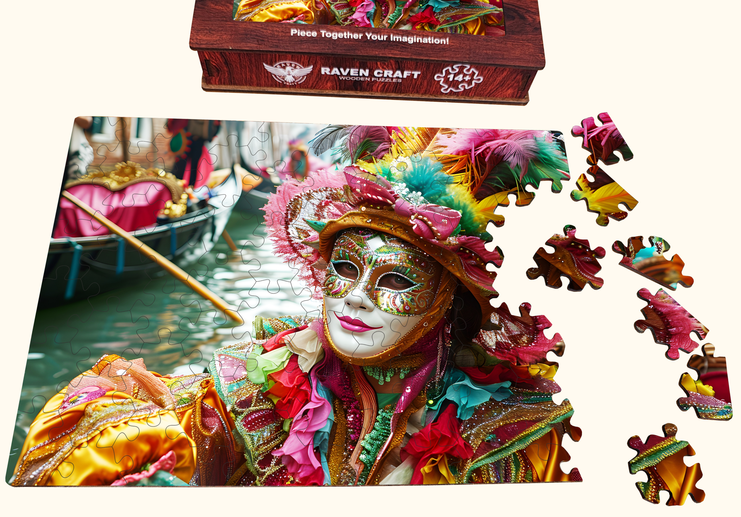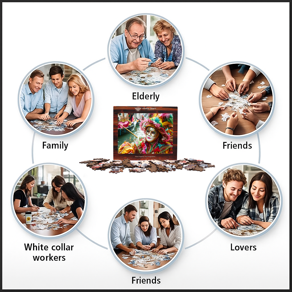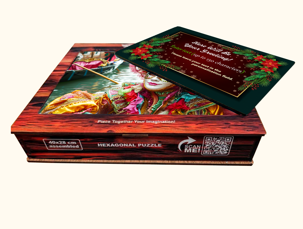 Inside is a vibrant wooden hexagonal puzzle featuring a dazzling Venetian carnival mask — full of color, detail, and artistry. It’s not just a puzzle; it’s an experience. A relaxing, immersive activity that turns into a beautiful display piece once completed.