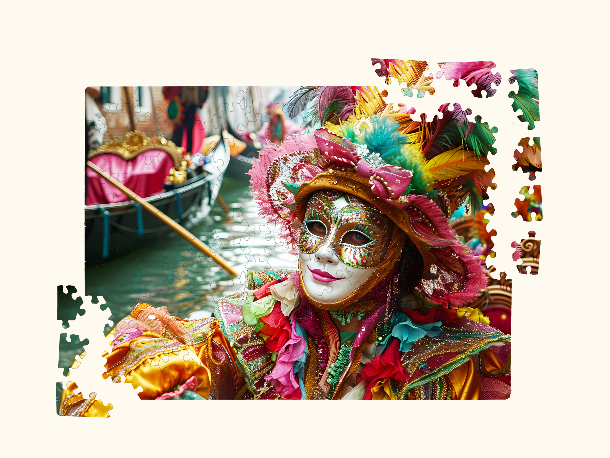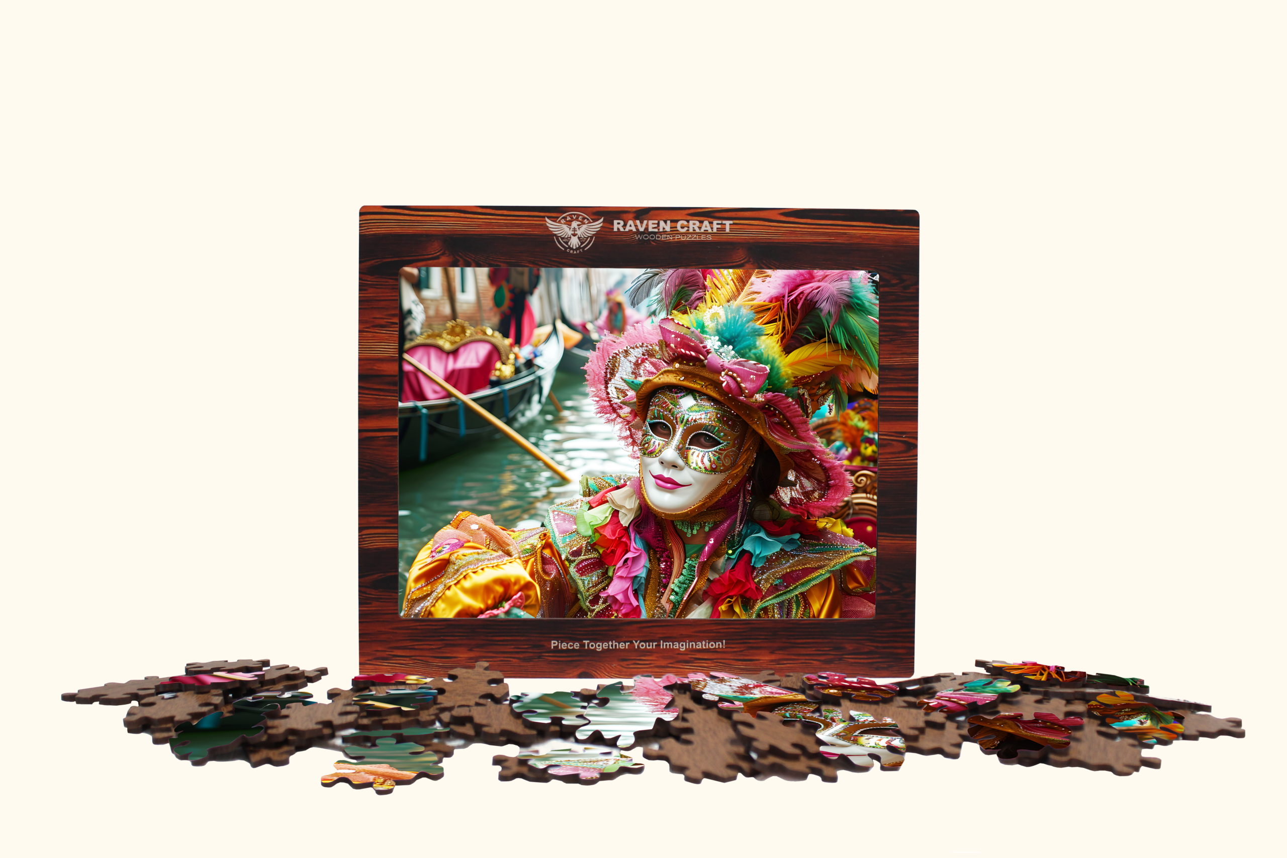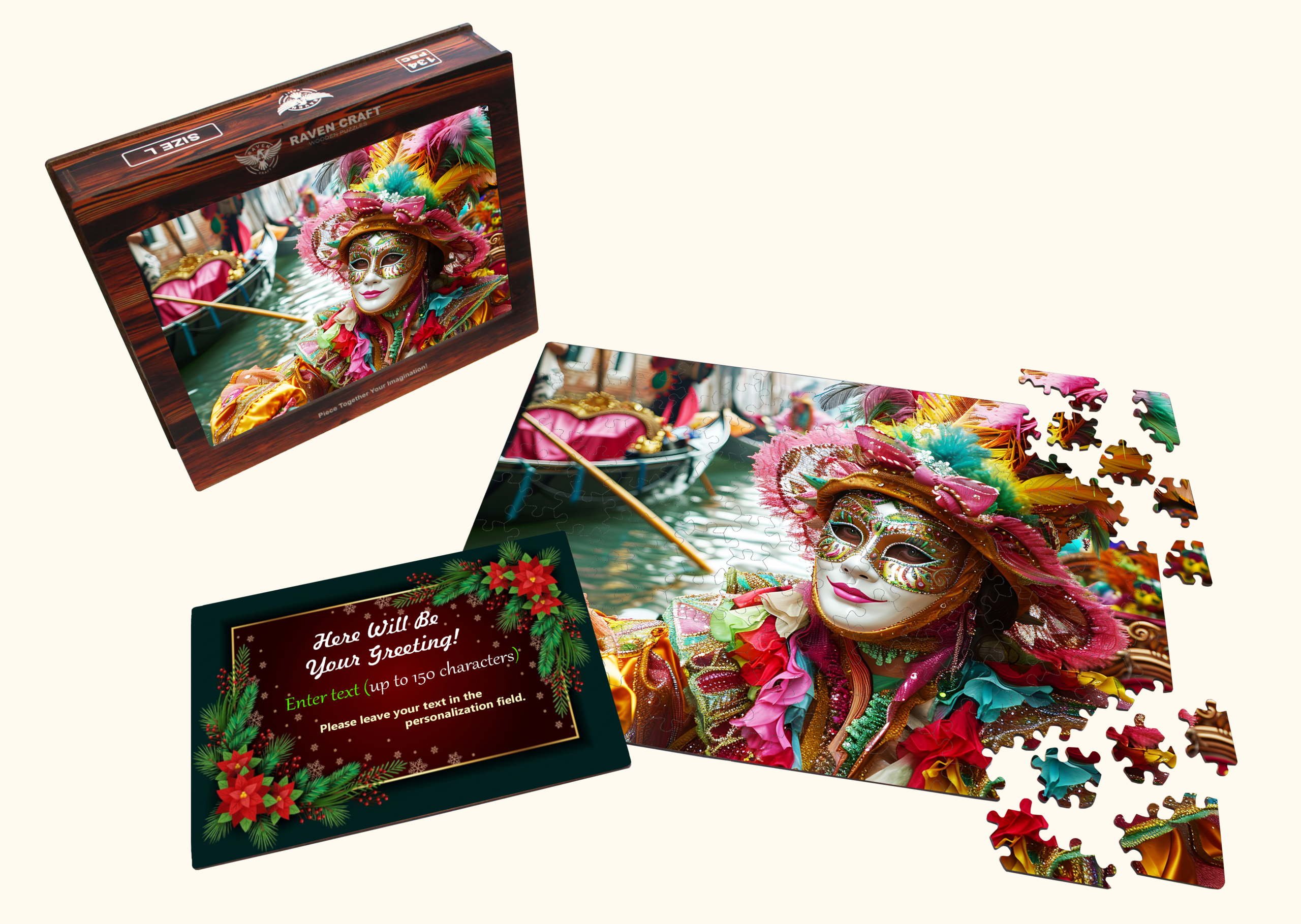 Inside is a vibrant wooden hexagonal puzzle featuring a dazzling Venetian carnival mask — full of color, detail, and artistry. It’s not just a puzzle; it’s an experience. A relaxing, immersive activity that turns into a beautiful display piece once completed.