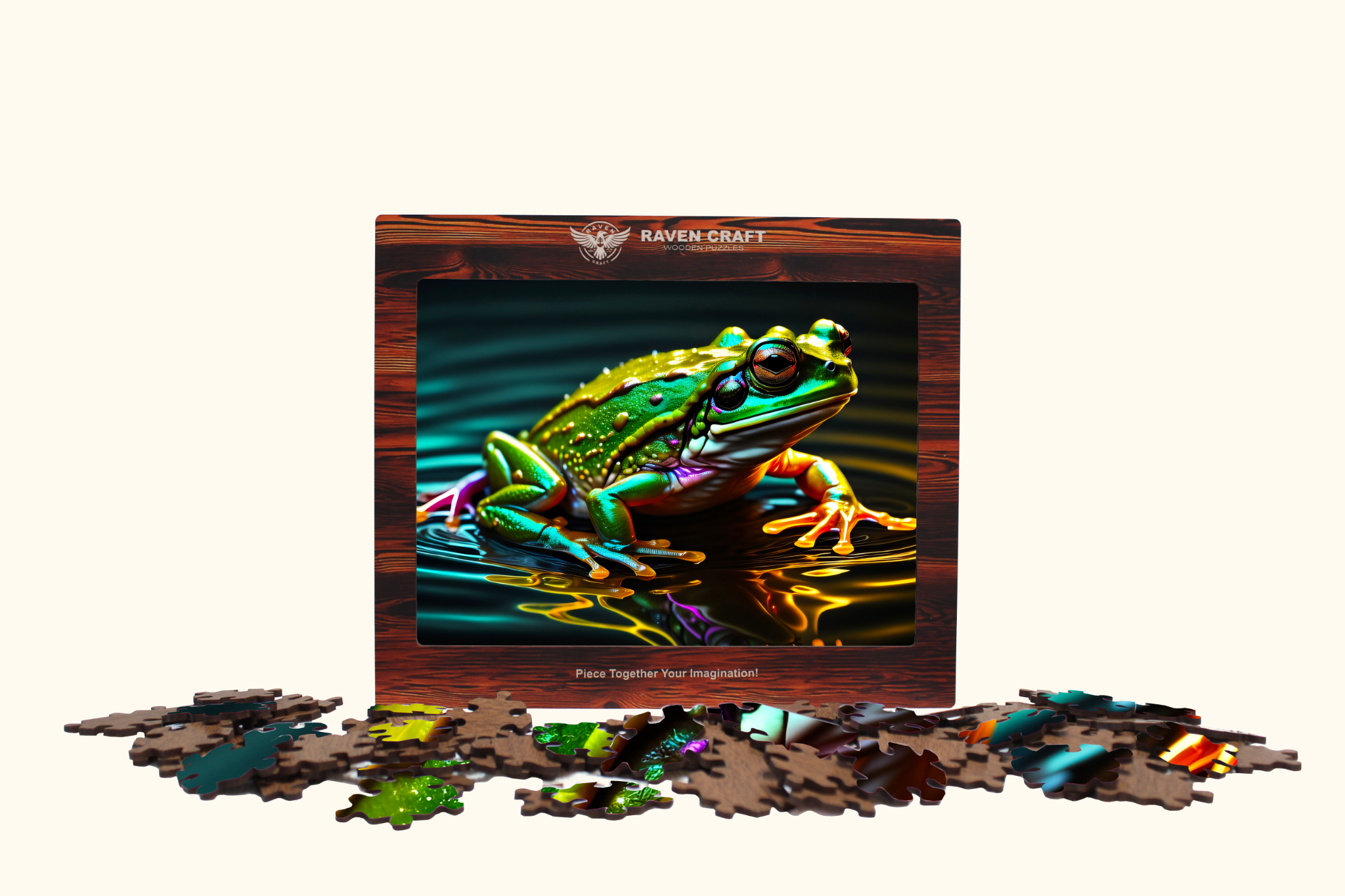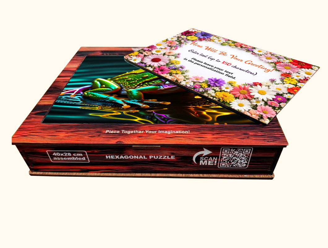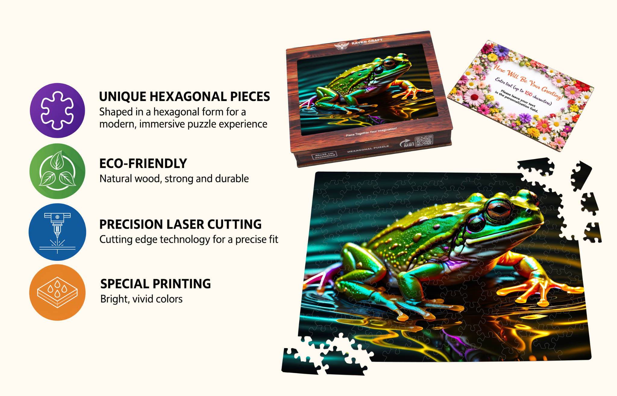 Bring color, character, and a thoughtful gift detail together with the Vibrant Green Frog Hexagonal Wooden Puzzle. This wooden puzzle features a striking frog design with vivid green tones, bright highlights, and a glossy water-inspired background that gives the artwork a bold, eye-catching look.