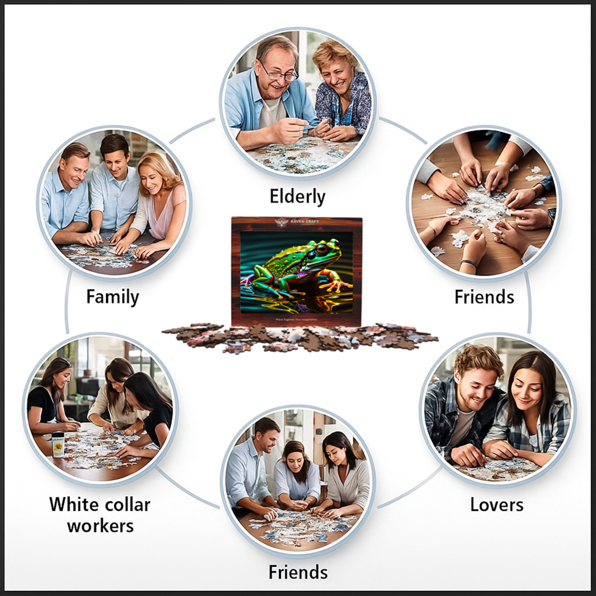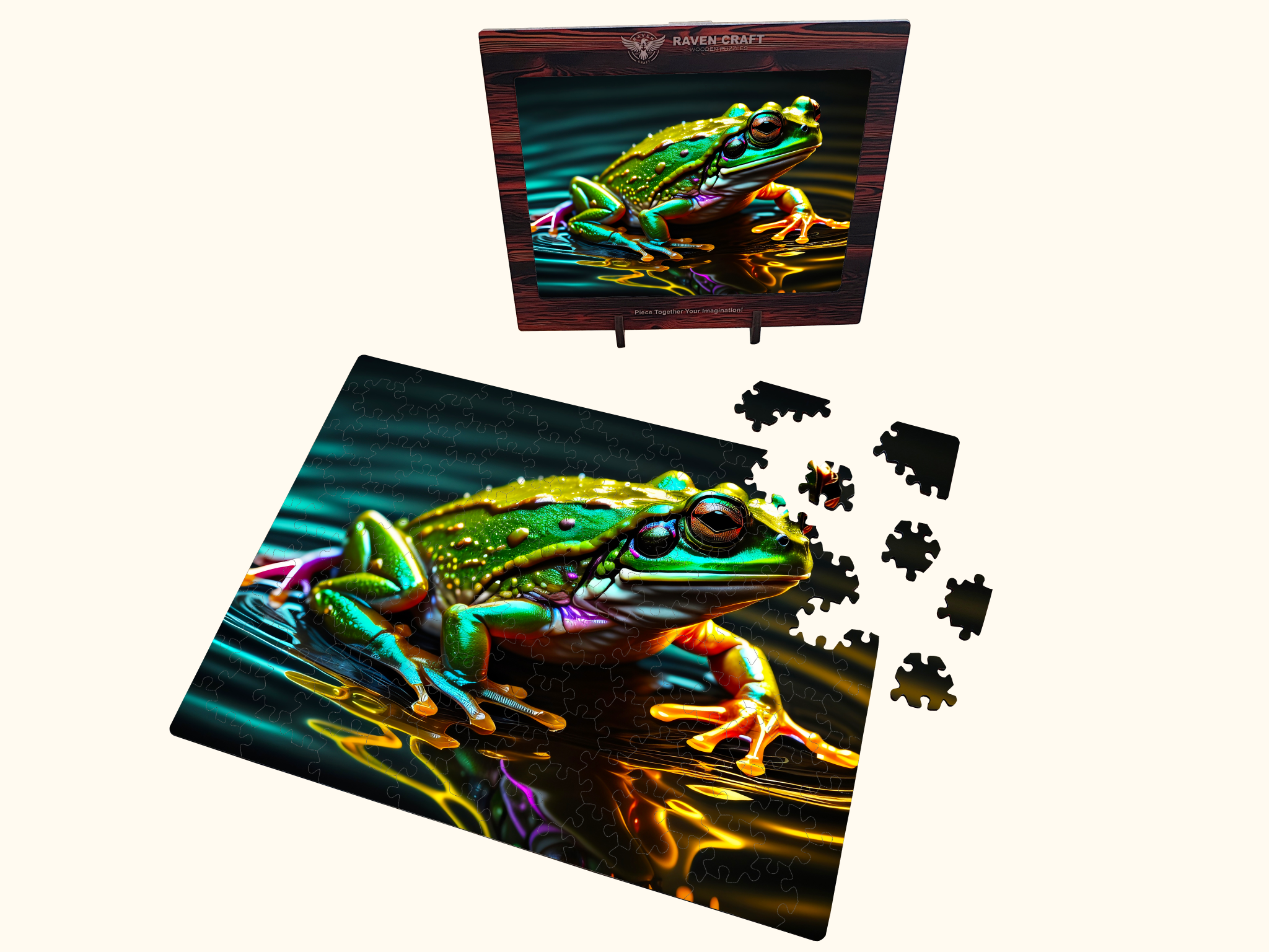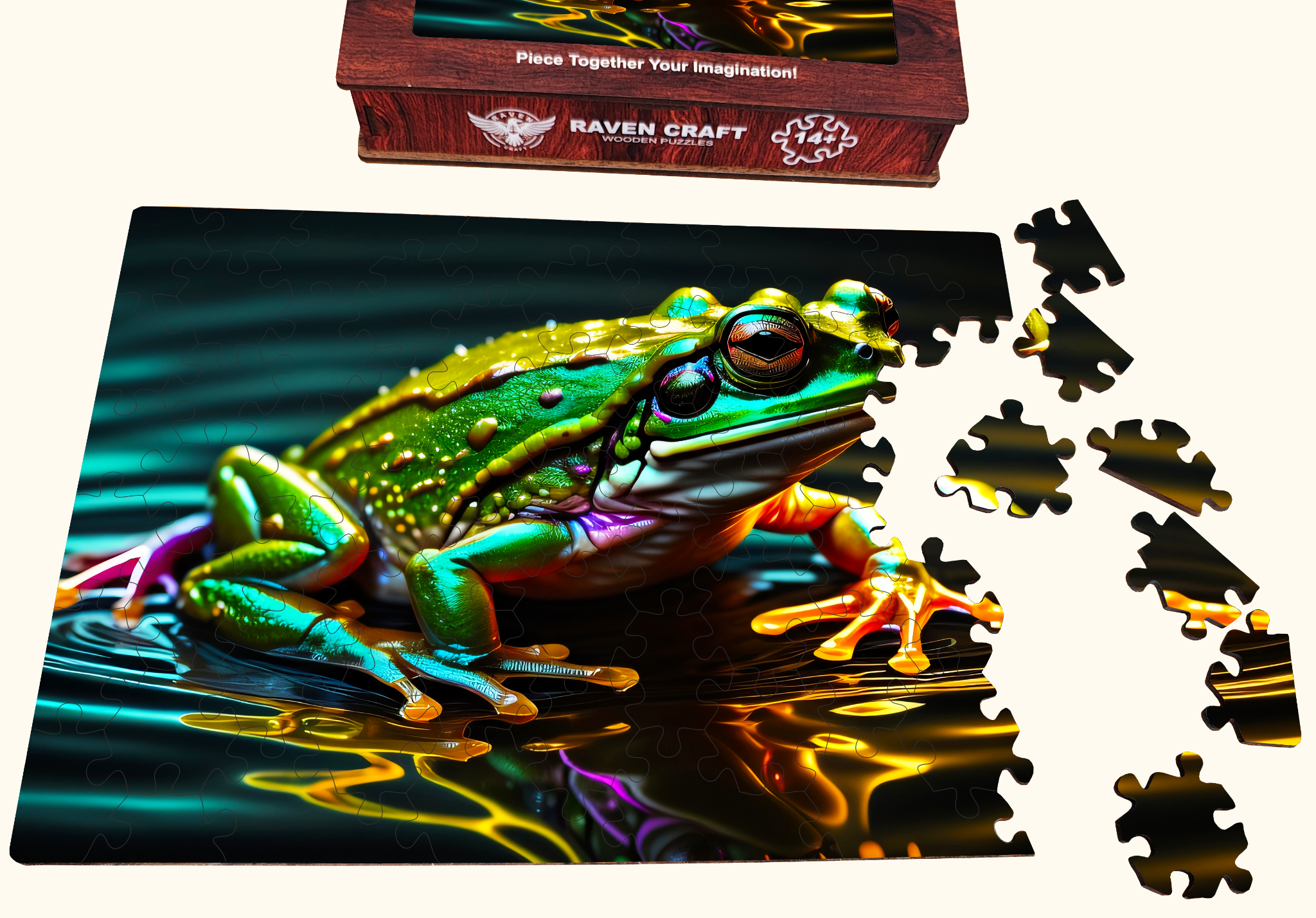 Bring color, character, and a thoughtful gift detail together with the Vibrant Green Frog Hexagonal Wooden Puzzle. This wooden puzzle features a striking frog design with vivid green tones, bright highlights, and a glossy water-inspired background that gives the artwork a bold, eye-catching look.