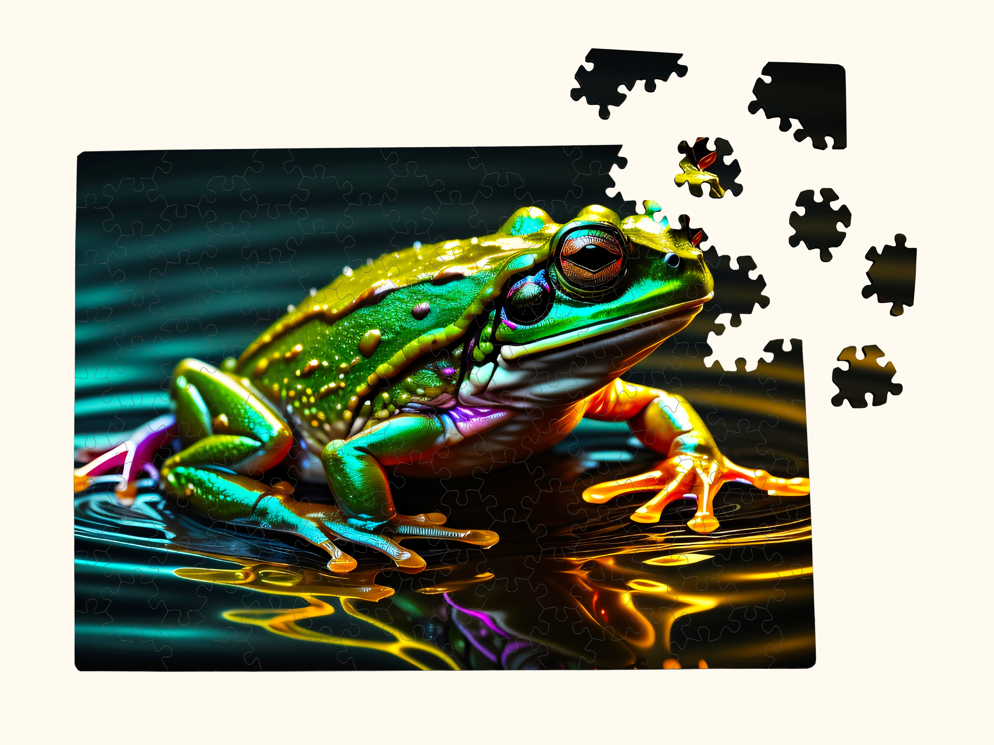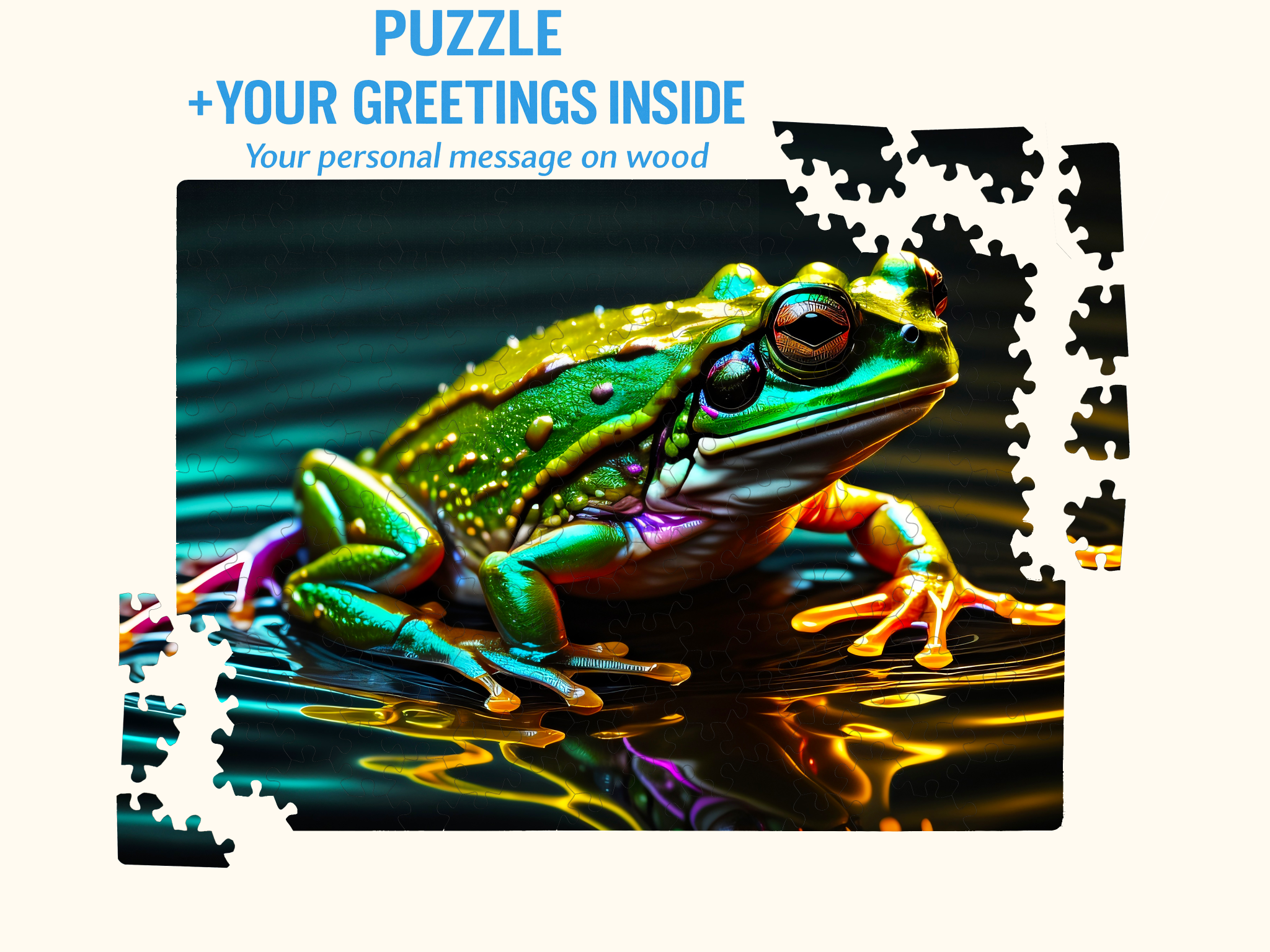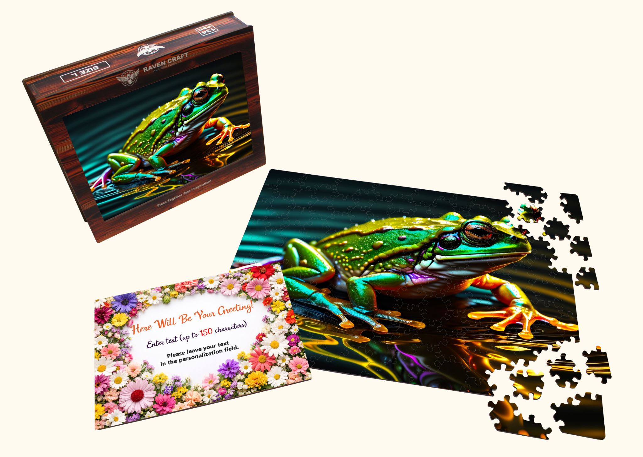 The design stands out through its rich contrast, detailed frog motif, and playful puzzle layout with loose pieces adding a sense of discovery. The product image also presents a greeting element inside, making it suitable for buyers looking for a puzzle that feels more personal and gift-ready.
